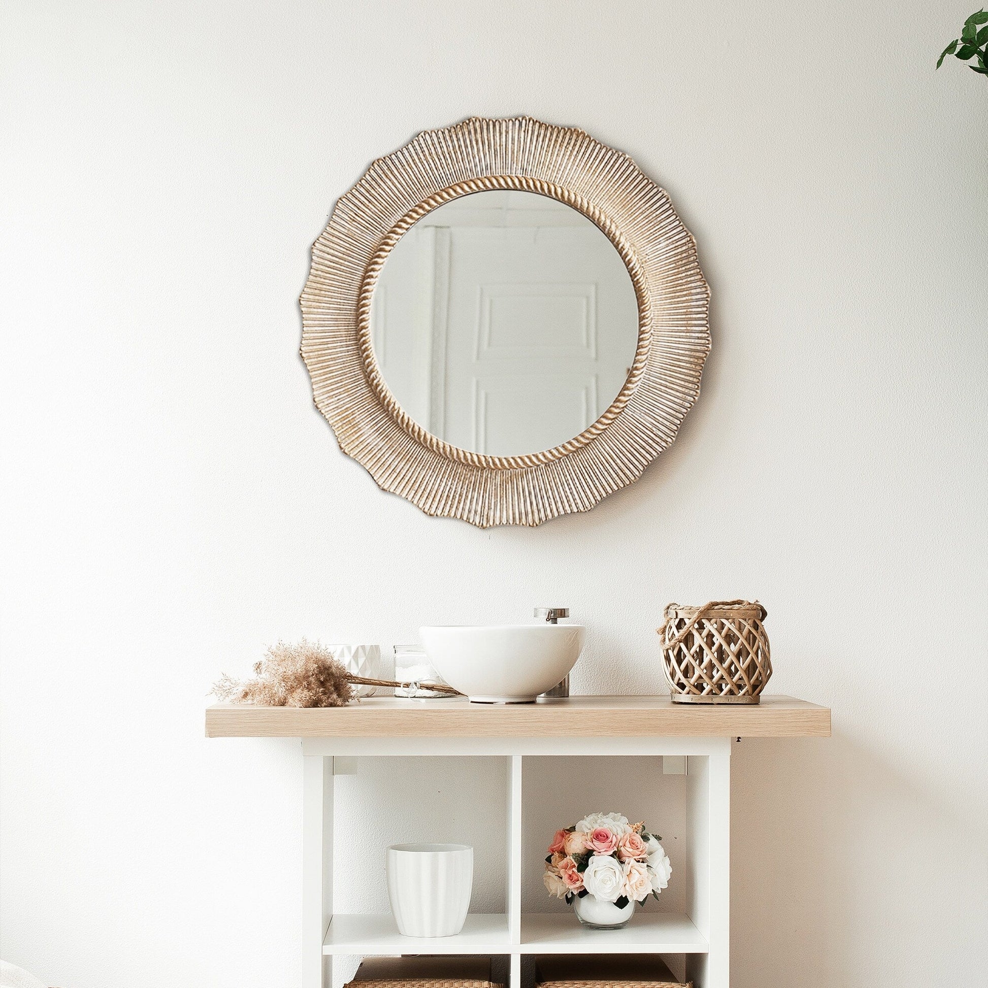• Special Design: Add a note of rustic refinement to your living space with this wall mirror, made by artisans of wood, this mirror features simple round frame and wood wash finish, place it over a sink in a bath area for warmth and a rustic touch.