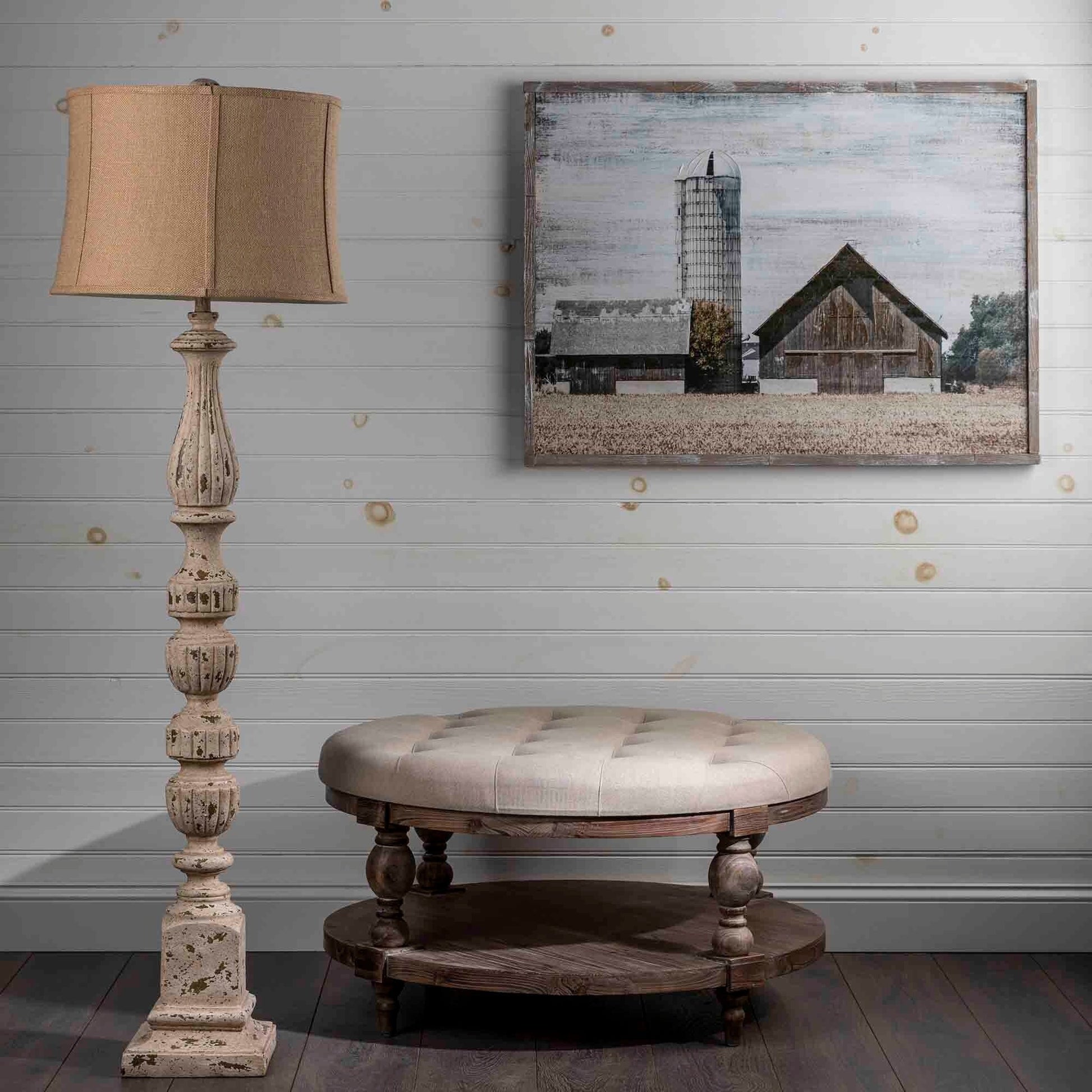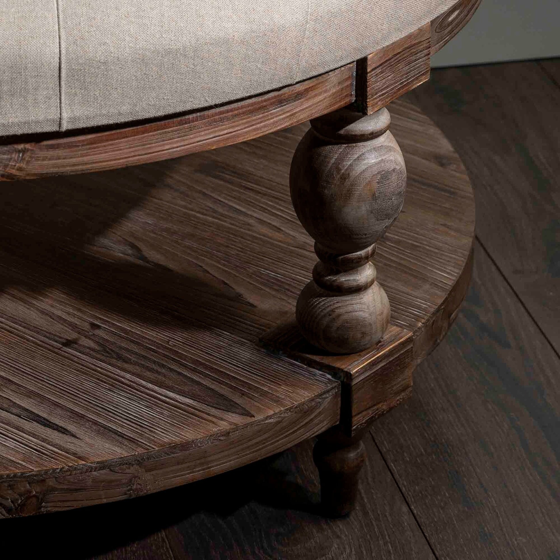 Tradition meets comfort in the Tahoe Rustic Wood and Round linen fabric Ottoman, with a lower shelf for storage and a padded top for your relaxation. The light brown fir wood finish on the turned legs adds depth to the cream colored linen fabric cushion, while you are resting your feet or using the ottoman as a temporary spot to sit. The oval shape fits into most spaces easily.