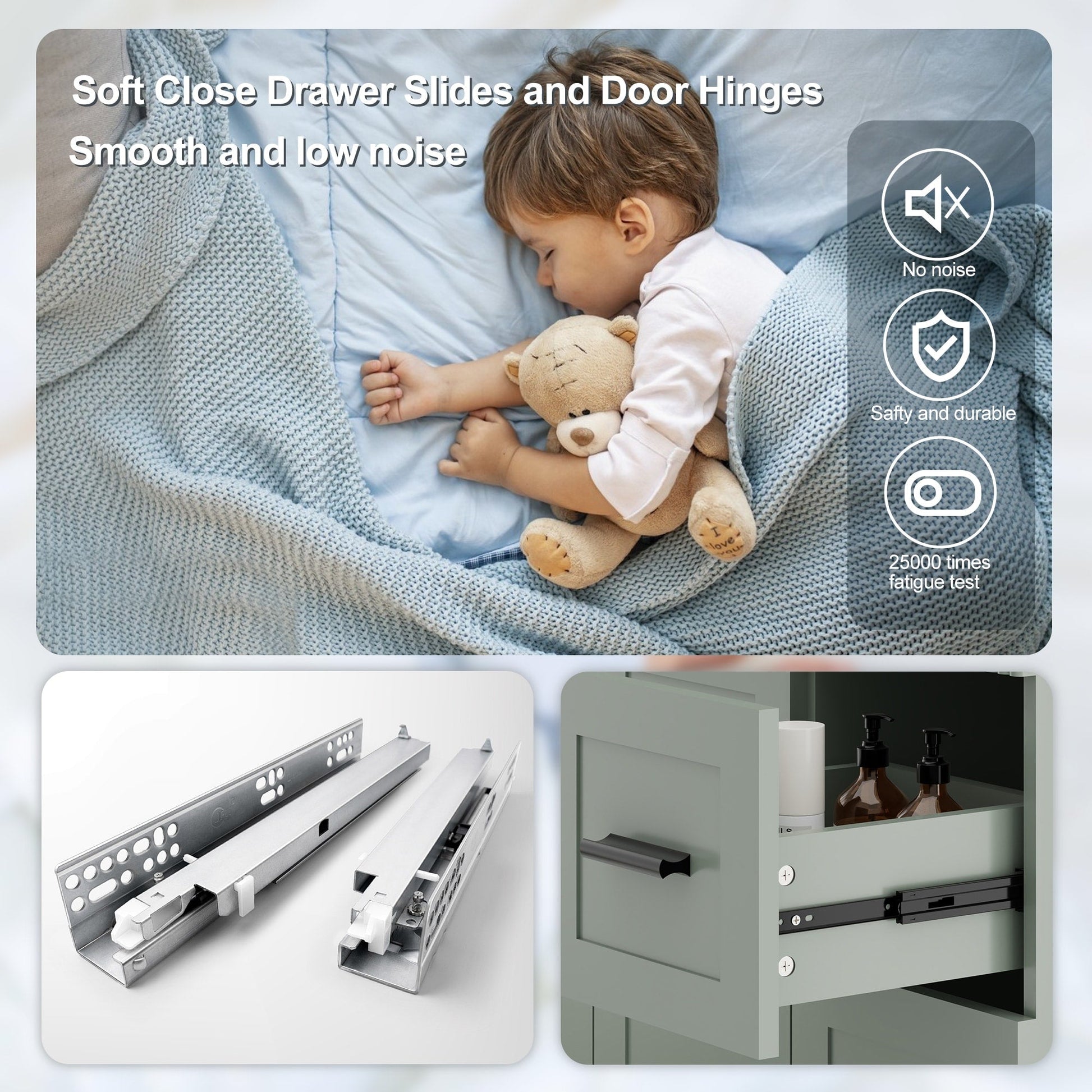 • Premium Soft-Close Drawers: Stainless steel undermount slides (25,000-cycle tested) ensure silent, smooth operation. 2 spacious drawers + adjustable shelf organize toiletries effortlessly.