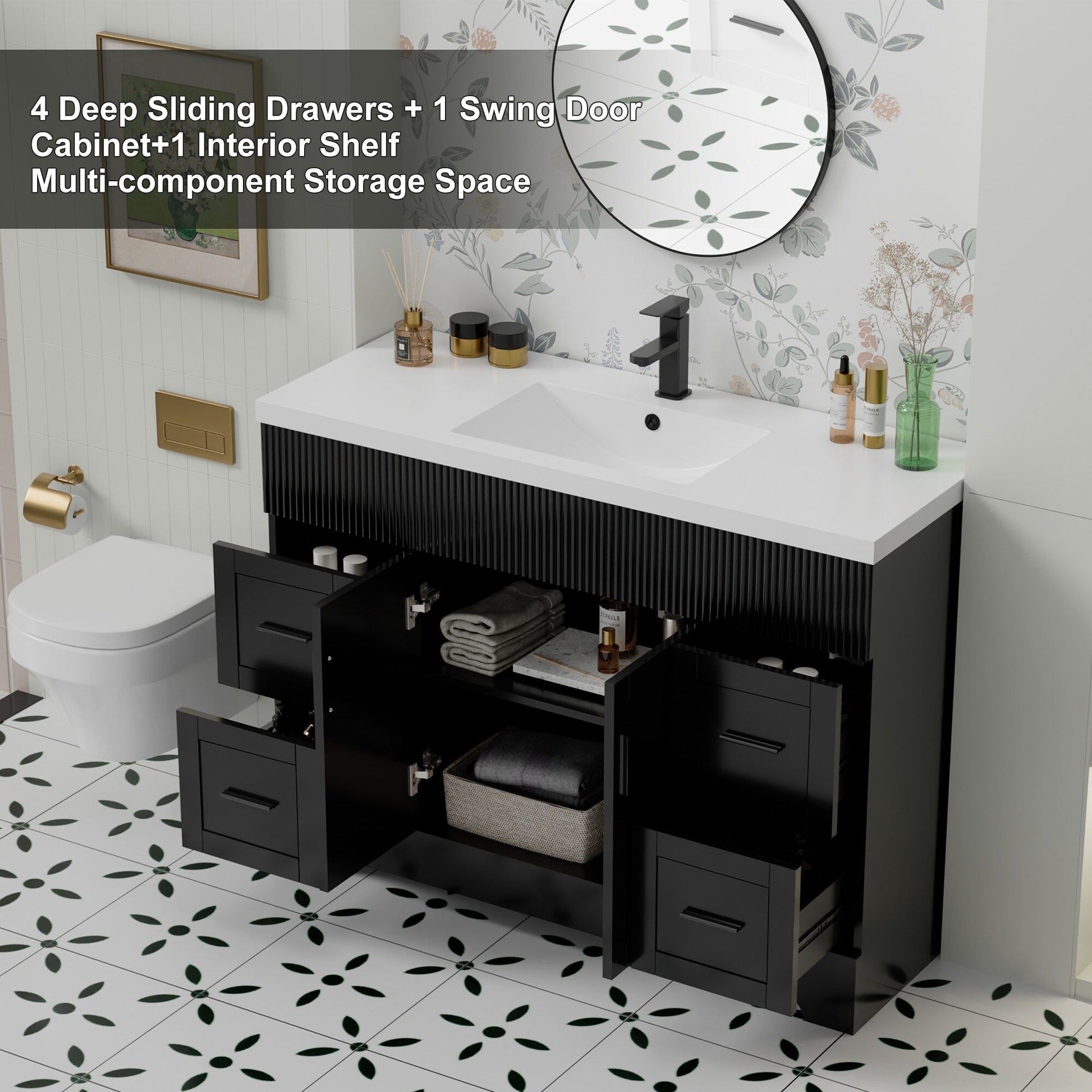 Upgrade your bathroom with this complete vanity set featuring eye-catching wavy line detailing. Available in 3 versatile sizes (30', 36', 48') and 3 on-trend colors (White, Green, Black), this freestanding vanity delivers contemporary style with exceptional storage. Premium wood construction ensures durability, while the included ceramic sink (30'/36') and lightweight SMC resin sink (48') offers easy maintenance.