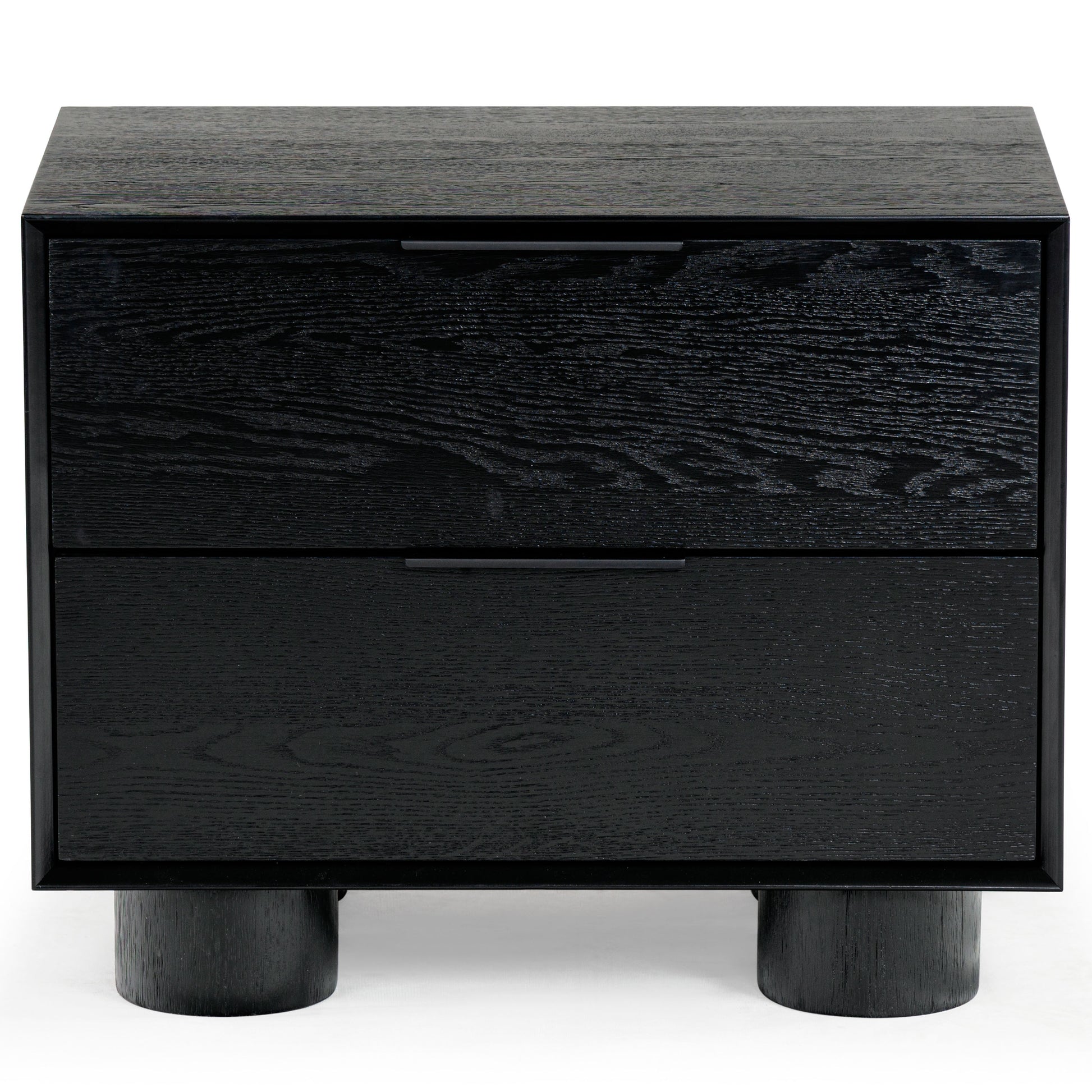 Introducing our ADDYSON WOOD 2 DRAWER NIGHTSTAND. This stable, dependable nightstand is a magnificent addition to any bedroom setup, handcrafted from SOLID RUBBER WOOD and OAK VENEER. Exuding an enticing black hue, this stunning piece adds to your room's aesthetics while lending a touch of convenience.