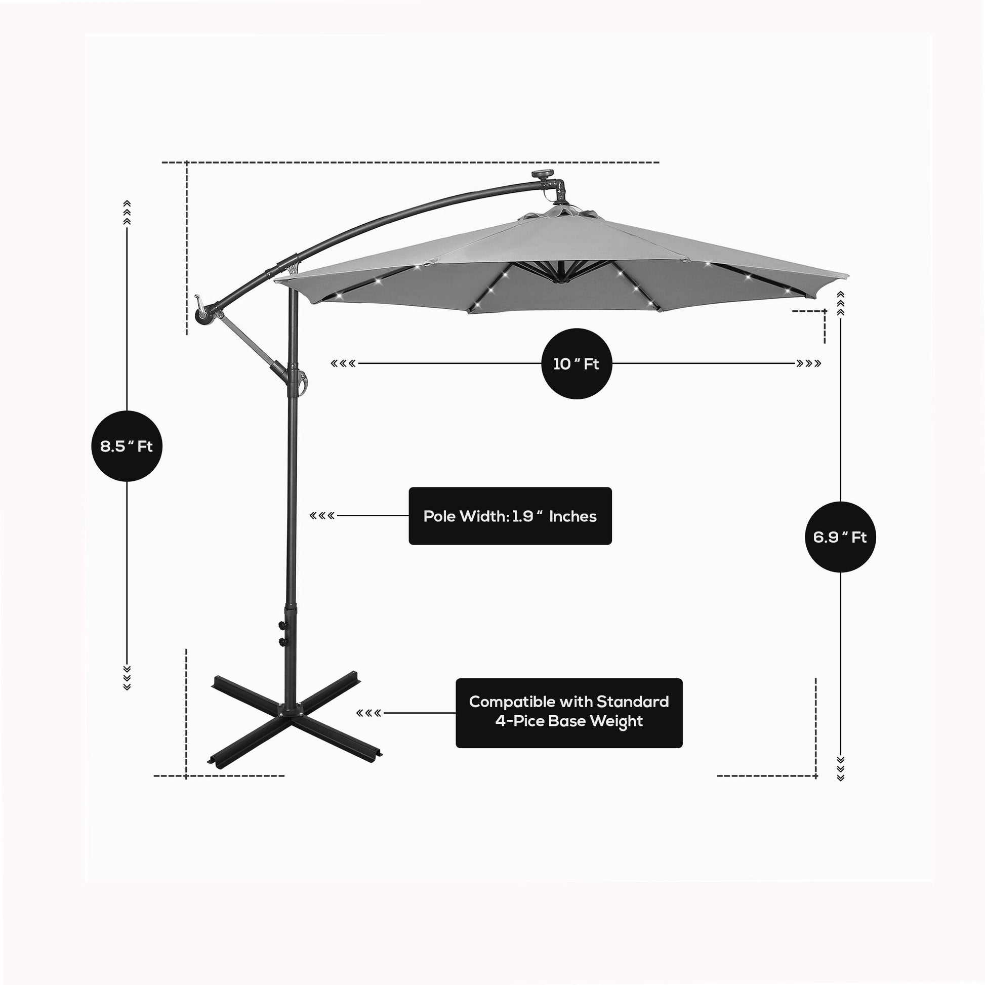 Create a cozy atmosphere in your outdoor space with our 10 Ft. Solar Power Lighted Patio Umbrella with Base Stand. This cantilever hanging outdoor umbrella is resistant to harmful UV rays, ensuring enduring quality and comfort. The sturdy steel framing is weather-resistant and built to last, making it easy to open and close the umbrella with the convenient crank mechanism. The combo set includes everything you need to create your perfect oasis.