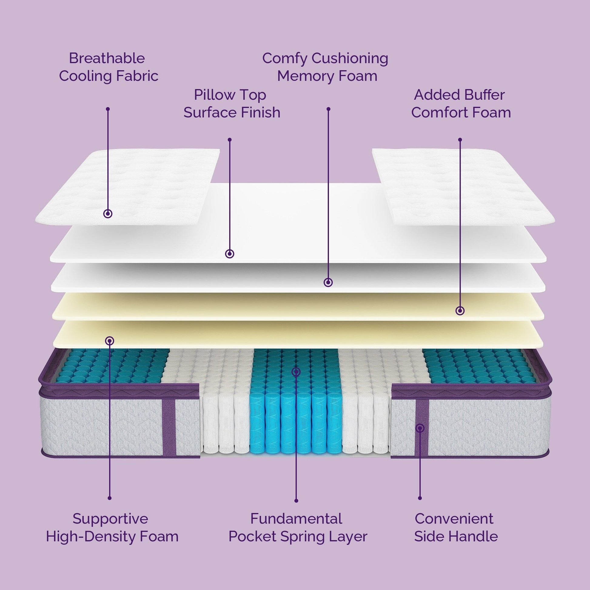 • Ultra quiet - due to the pocket spring + multilayer foam design, this mattress can effectively absorb noise and vibration; no wake-up-up caused by tossing and turning, and no disturbing companion.