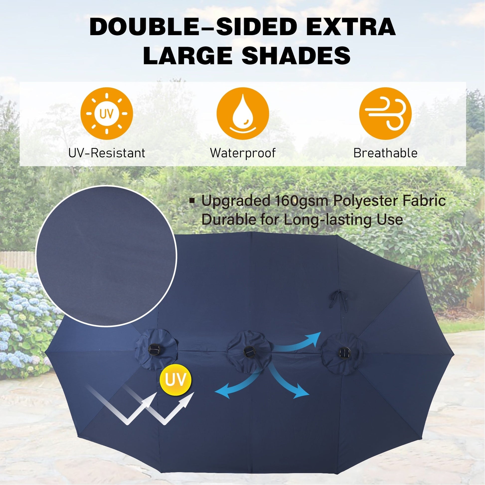 15-foot Rectangular Crank Double-sided Outdoor Market Umbrella Solar LED Lighted Patio Umbrella with Base Included
