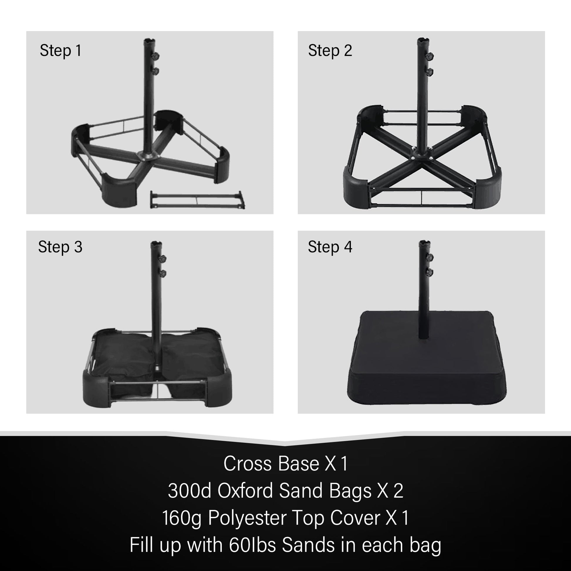• Umbrella Base Included for Easy Setup: Comes with a sturdy steel cross base along with two durable sandbags made of 300D Oxford fabric and one top cover from 180G polyester fabric. We recommend using 100 lbs of sand for each bag to ensure stability.