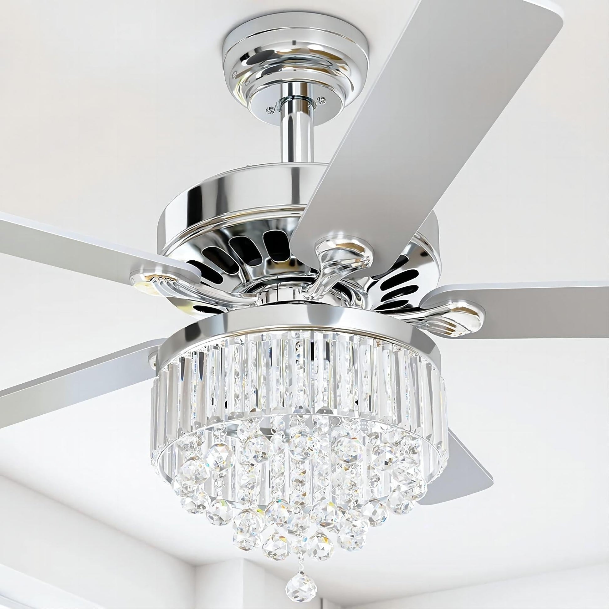 Elevate your home with the exquisite charm of our 52-inch Wooden 5-Blade Crystal Ceiling Fan Chandelier. Combining crystal elegance with silver-stained wooden blades, this modern masterpiece effortlessly enhances any room. Stay comfortably cool with its three-speed motor and impressive airflow, while enjoying the cost-efficient benefits. Complete with a convenient remote control, effortlessly adjust the fan speed and lighting to create the perfect ambiance for every occasion. Add a touch of grandeur to your space with this remarkable chandelier ceiling fan.