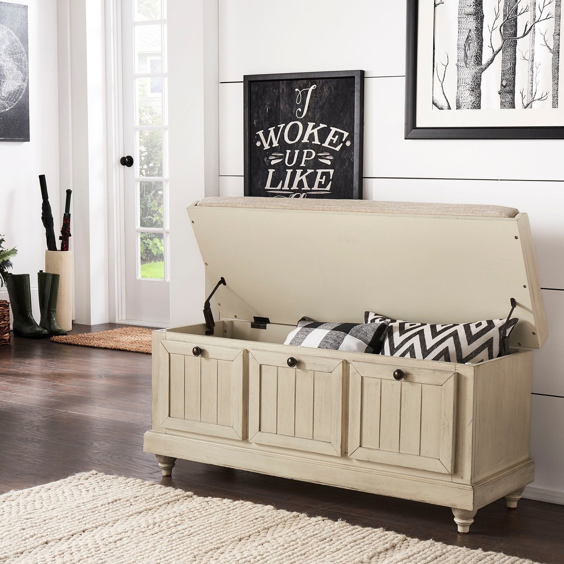 The iNSPIRE Q Granger storage bench provides your entry way with charming style and function. This bench features a soft, beige, or grey, upholstered seat cushion that offers up a comfortable spot to put on or remove shoes while entering or leaving the house, while the top lifts to reveal an interior storage compartment which serves as the perfect spot to tuck away shoes and other accessories from plain sight. The front of the bench showcases the appearance of wood paneled cupboards that accent a farmhouse or rustic setting perfectly. Choose from various finishes to best fit your home's personal style.