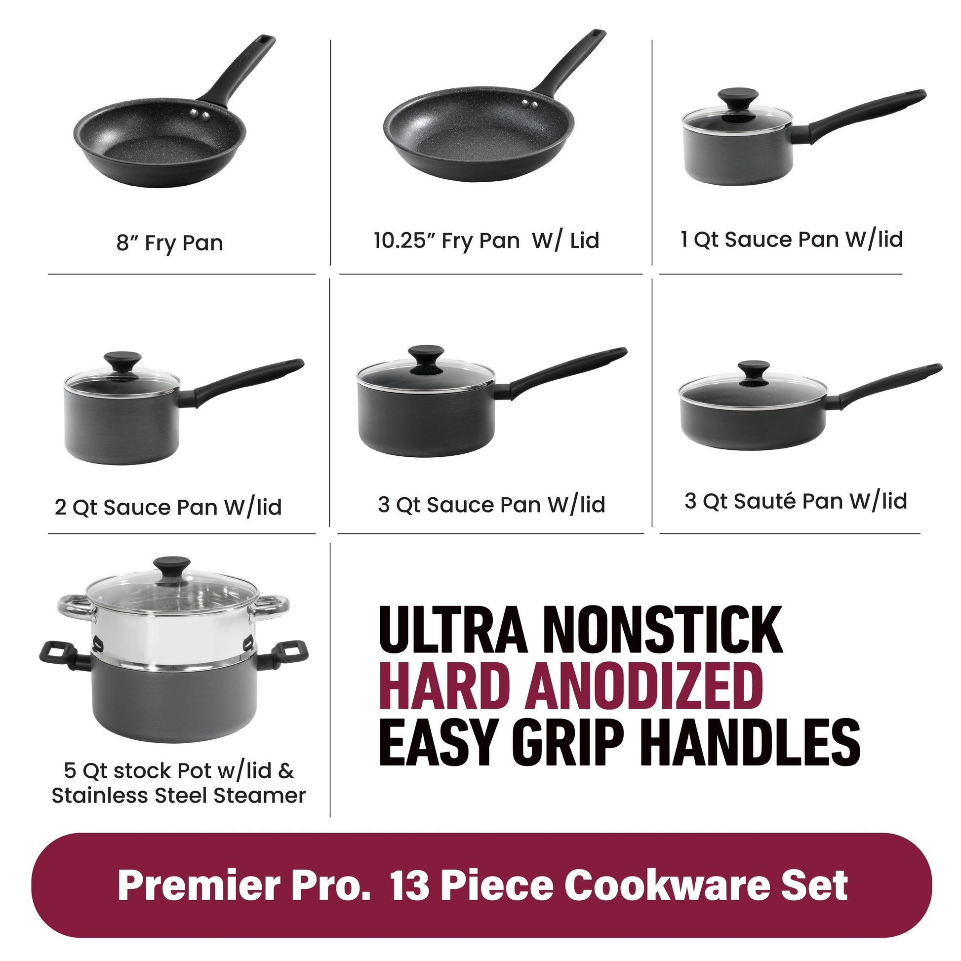 • Complete 13 Piece Set: Includes 8” skillet, 10.25” fry pan with lid, 1.5 qt, 2 qt, and 3 qt saucepans with lids, 3 qt sauté pan with lid, 5 qt stock pot with lid, and stainless steel steamer insert for a comprehensive kitchen solution.