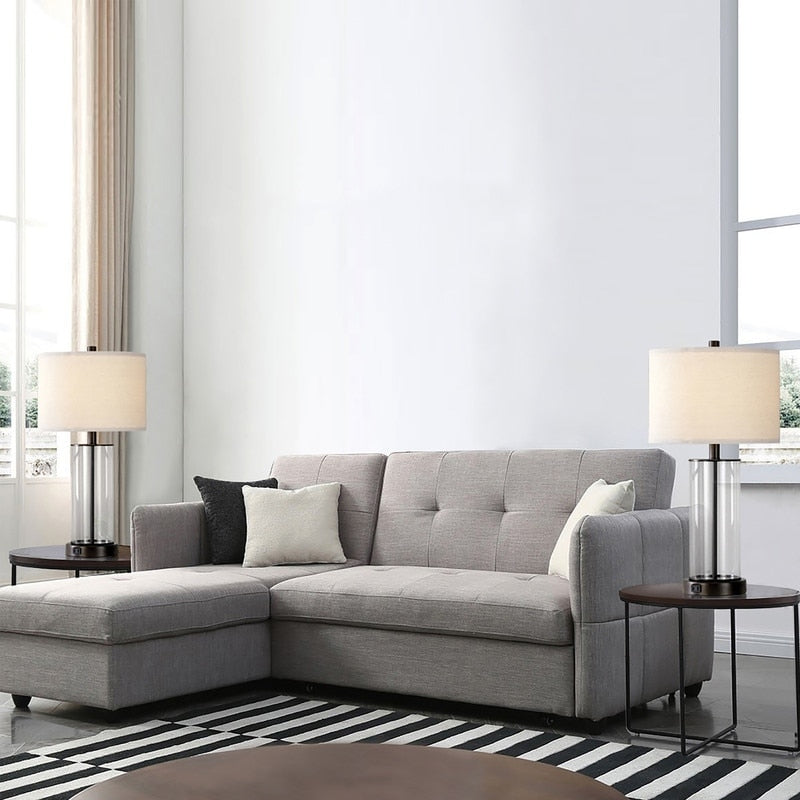 The striking silhouette is expertly handcrafted of clear glass, its large cylinder revealing a sleek stem. A cream-colored linen shade provides a tonal beauty, and the sleek metal neck, and base beautifully set off the clear glass and lend a note of glamour. It's easy to turn it on/off or adjust the brightness via touch control. Equipped with a dual USB port and one AC outlet to keep your smartphones, laptops, pads and other devices charging even if the light is off. Come with two lamps.