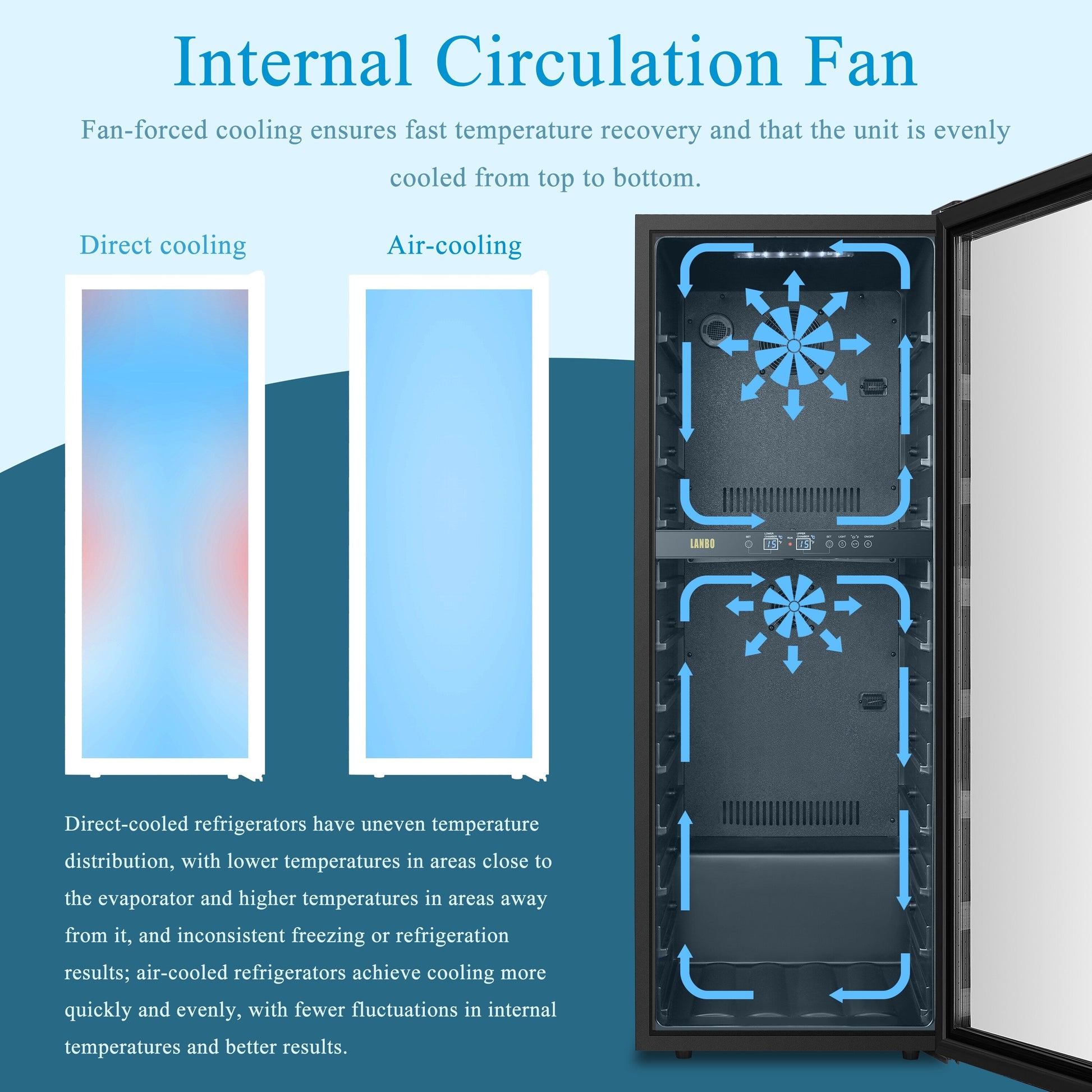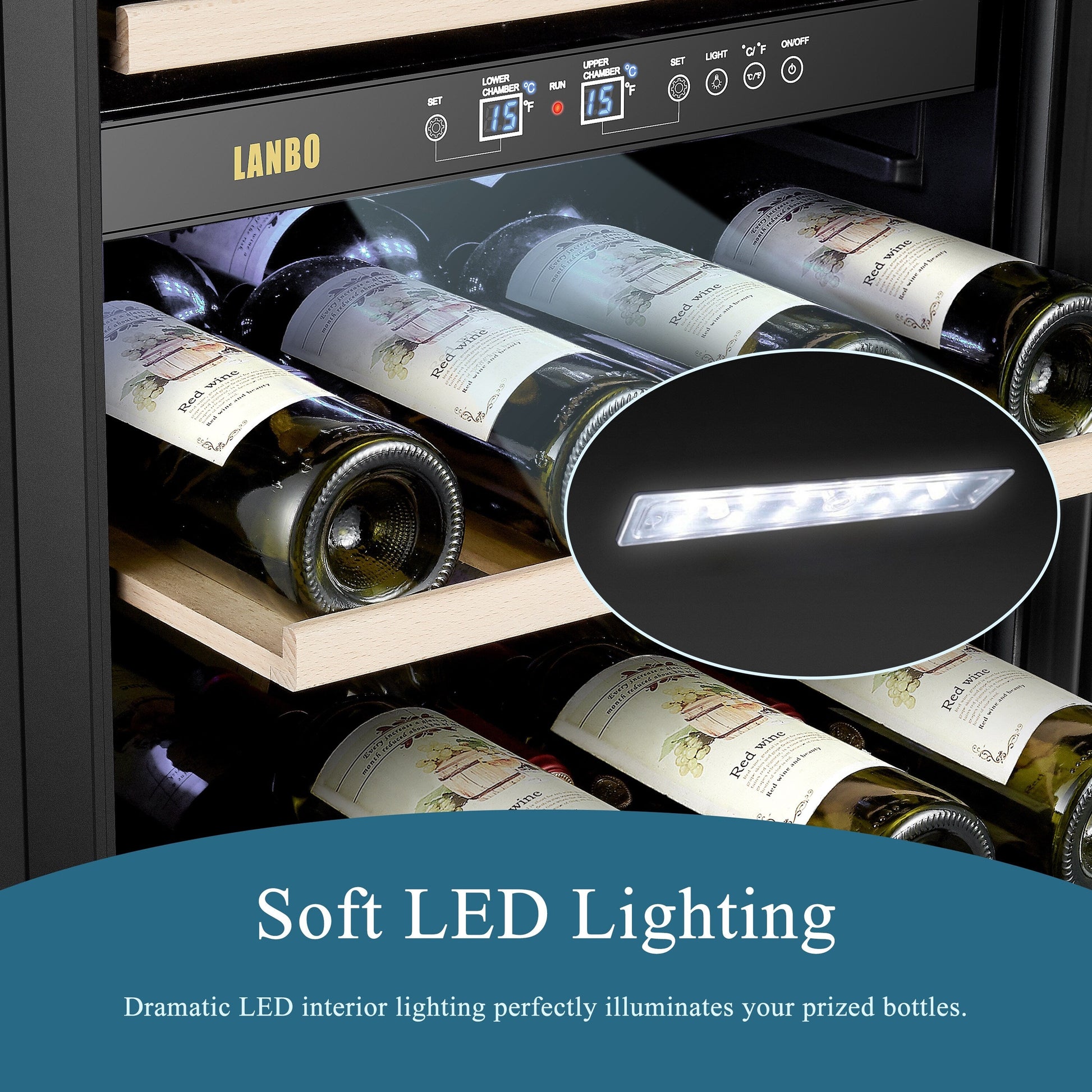 The Lanbo LW80D Dual Zone Wine Cooler combines long-term storage and short-term chilling in one sleek, state-of-the-art package. Energy-efficient compressor cooling technology ensures temperature stability and a long lifespan to protect your investments. Fan-forced cooling guarantees even temperature distribution and rapid temperature recovery. The digital control panel allows you to set the temperature between 54º and 64ºF for red wine in the bottom zone and between 41º and 54ºF for white and sparkling wine in the top zone. 5 durable beech wood shelves can hold up to 64 bottles of wine. Stainless steel trim seamlessly integrates with the double-pane tempered glass door for an elegant look, complemented by a professional stainless-steel handle. The user-reversible door includes a front lock to secure your collection. This sleek wine fridge will illuminate and enhance any room it graces.