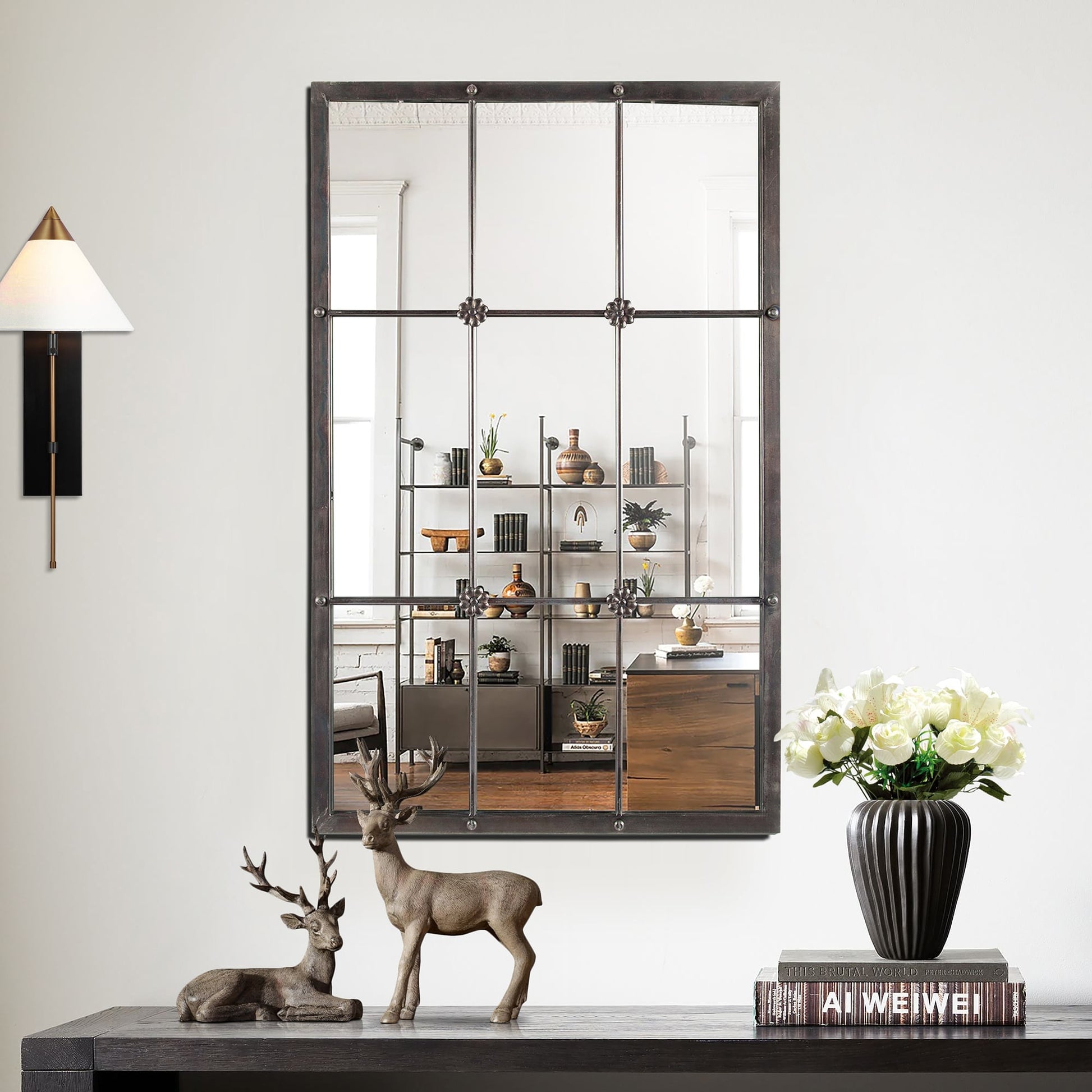 Rustic Brown Metal Frame Windowpane Accent Wall Mirror...