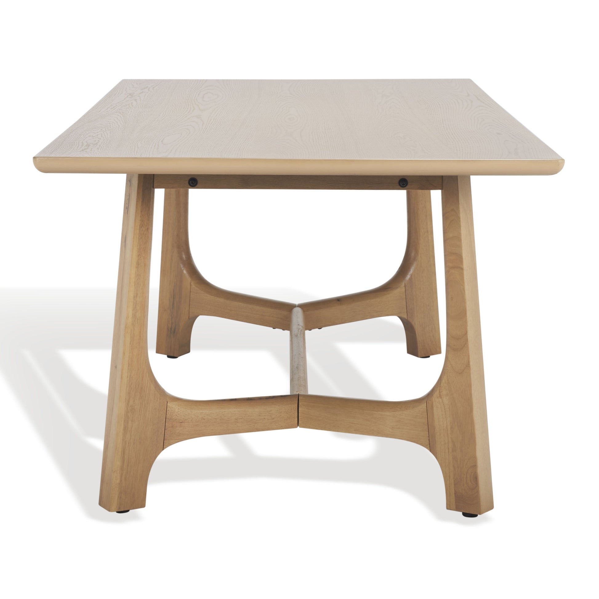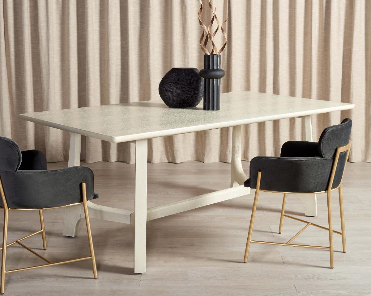 Lend a sleek and modern update to your home with the Adelee dining table. A smooth and perfectly crafted rectangular table sits upon an elegant v-shaped trestle base. The sharp edges of the trestle base are softened with graceful curves. Fashionable and functional, the table is adorned with white-washed Oak veneer to bring the elegance and warmth of natural textures to your home. Truly a versatile addition, our dining table can comfortably seat 8 individuals to serve as the perfect spot for enjoying casual meals and fancy feasts.