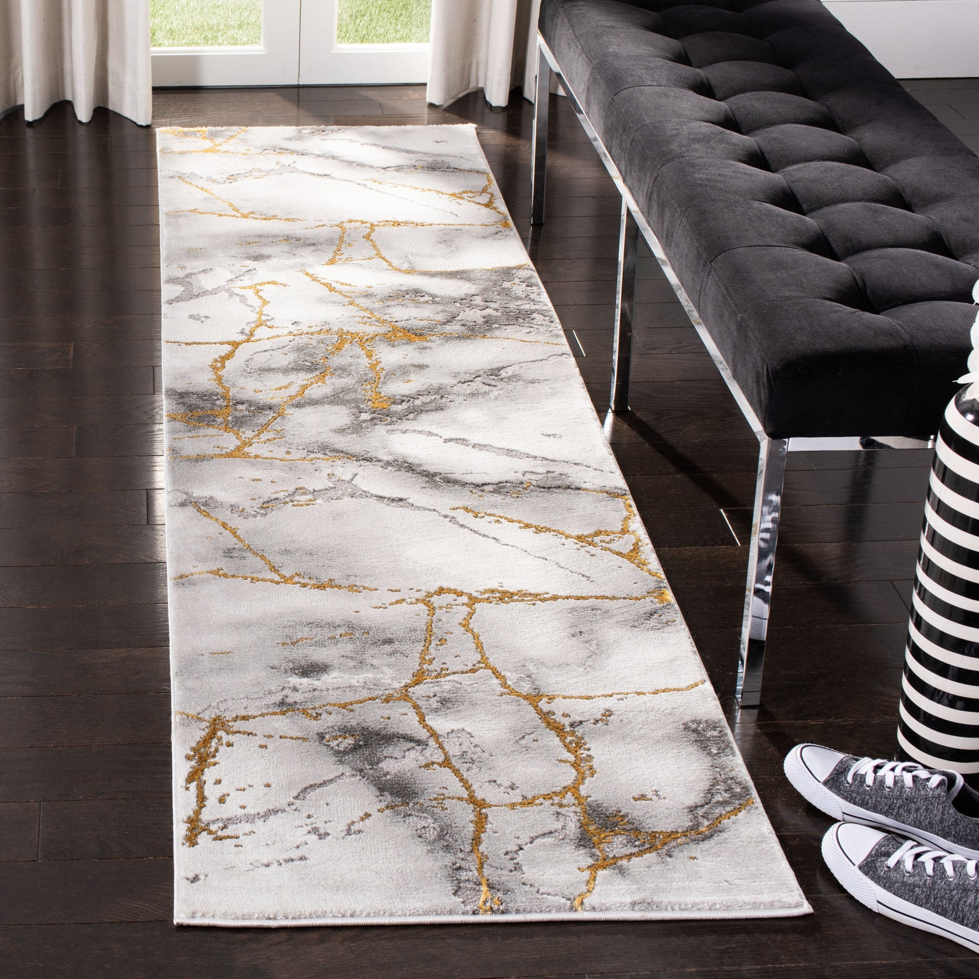 Discover luxury and modernity with our exquisite area rug, a statement piece boasting dimensions of 10'-6' X 14' in a large rectangular shape. Elevate your living space with this contemporary styled rug that blends a sophisticated grey palette with bold gold accents, creating a dynamic and luxurious look.Crafted using power-loomed technology, this area rug maintains precision and durability, ensuring a product that not only looks refined but stands the test of time. With a composition of 82% Polypropylene and 18% Polyester, it offers the ideal blend of softness and strength, making it both comfortable underfoot and resilient against everyday wear.At a height of 1/2', this rug provides a plush feel without being overly bulky, allowing for easy placement under furniture and in high-traffic areas. Plus, made in Turkey?a country renowned for its rich history of rug-making?this piece promises a blend of traditional craftsmanship with modern design.The OEKO-TEX certification of this rug guarantees that it has been tested for harmful substances, offering you peace of mind that your living environment remains safe and healthy.Infuse your home with elegance and a touch of opulence. This area rug, adorned with its unique pattern as depicted in the image, is a true representation of contemporary sophistication. Suitable for an array of interior designs, it will complement your home d?cor and become an instant focal point in any room.