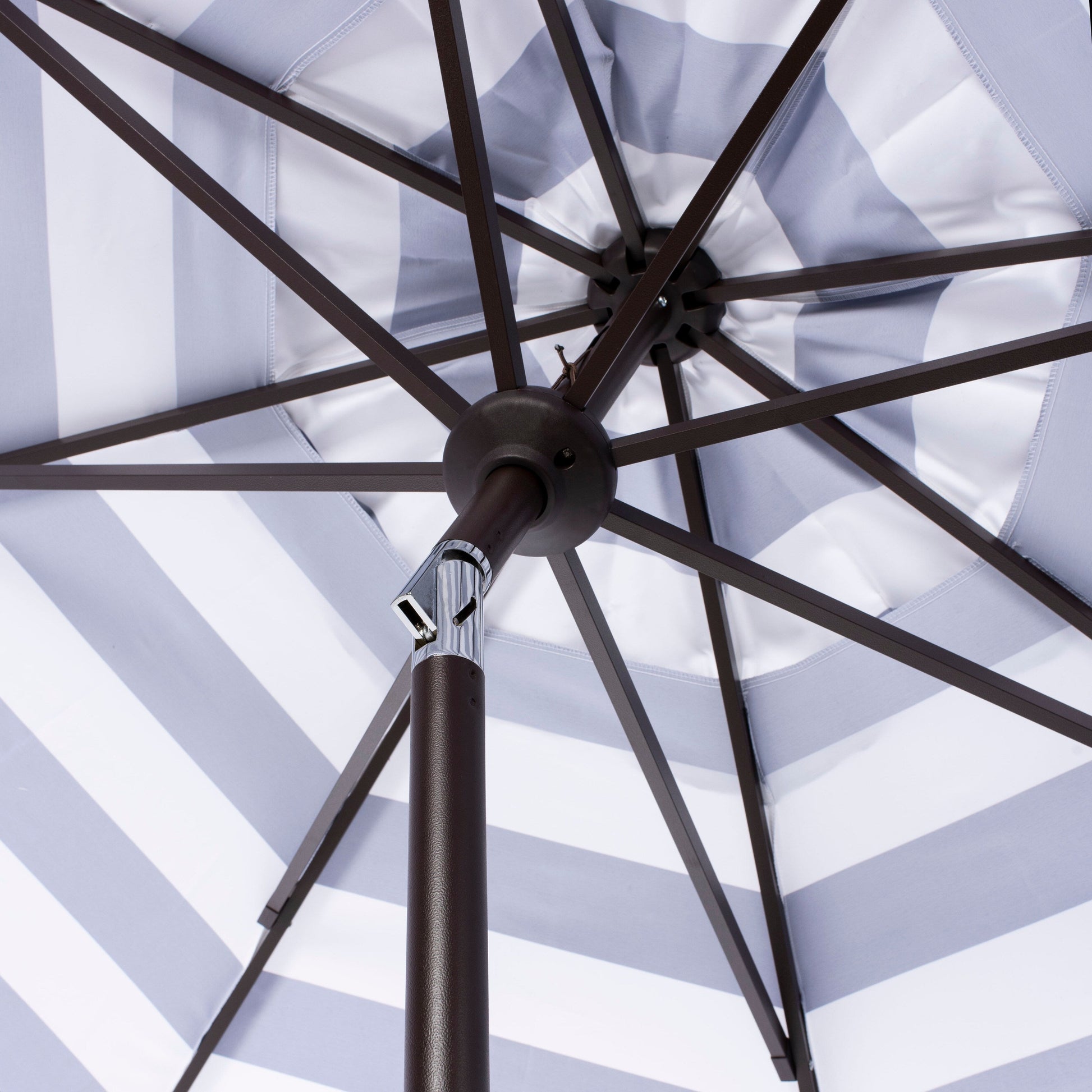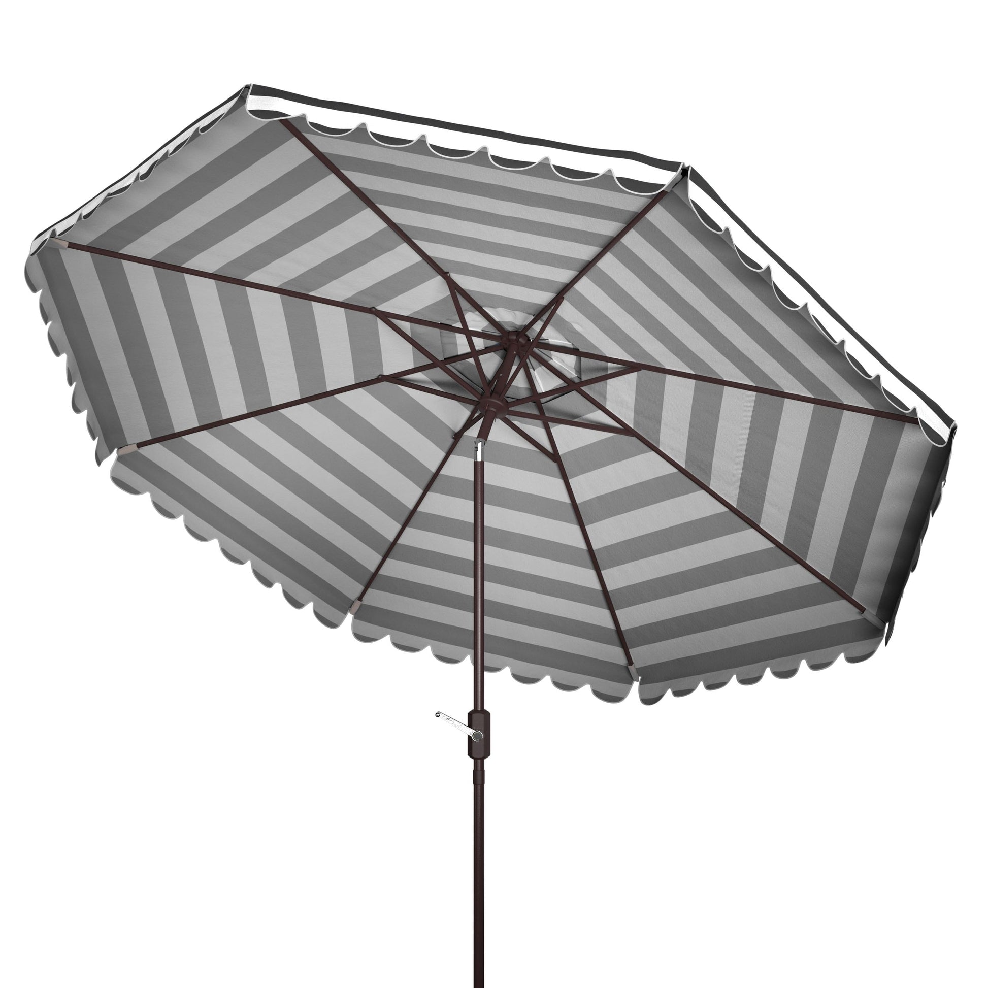 The stylish and white stripes and scalloped detail of this chic Umbrella fashionably elevates the art of sunbathing. Vienna's round polyester canopy protects you from harsh summer rays, and its brown aluminum post intelligently complements its neutral color palette.
