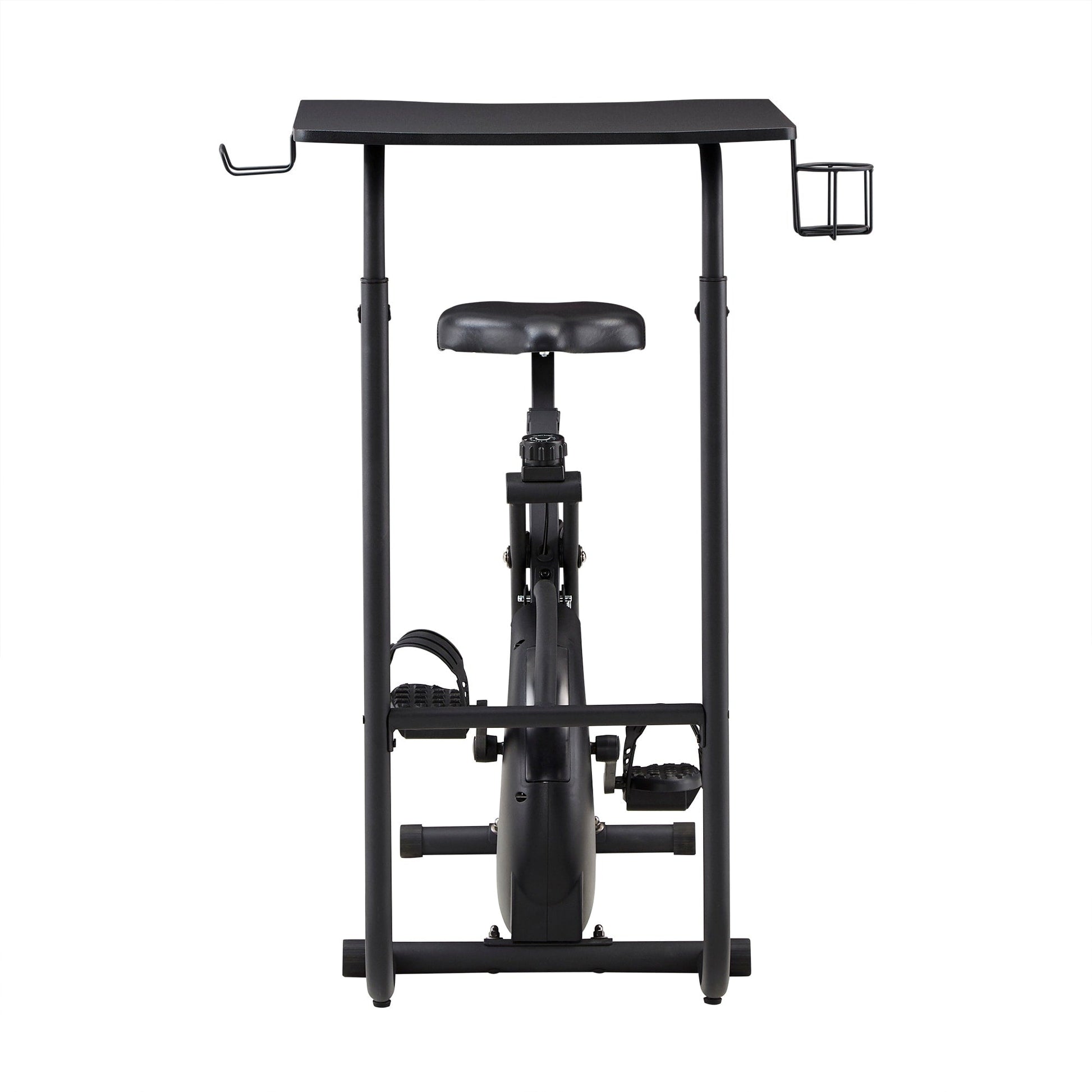 Stay active as you work with the Virgil Exercise Bike Desk by iNSPIRE Q Classic Perfect for spaces large and small, this ergonomic piece merges an exercise bike with a desk. Comfort and security comes from the padded seat and textured pedals with straps. The adjustable desktop features two side holders for a water bottle and your headphones, so everything you need is in one convenient place.