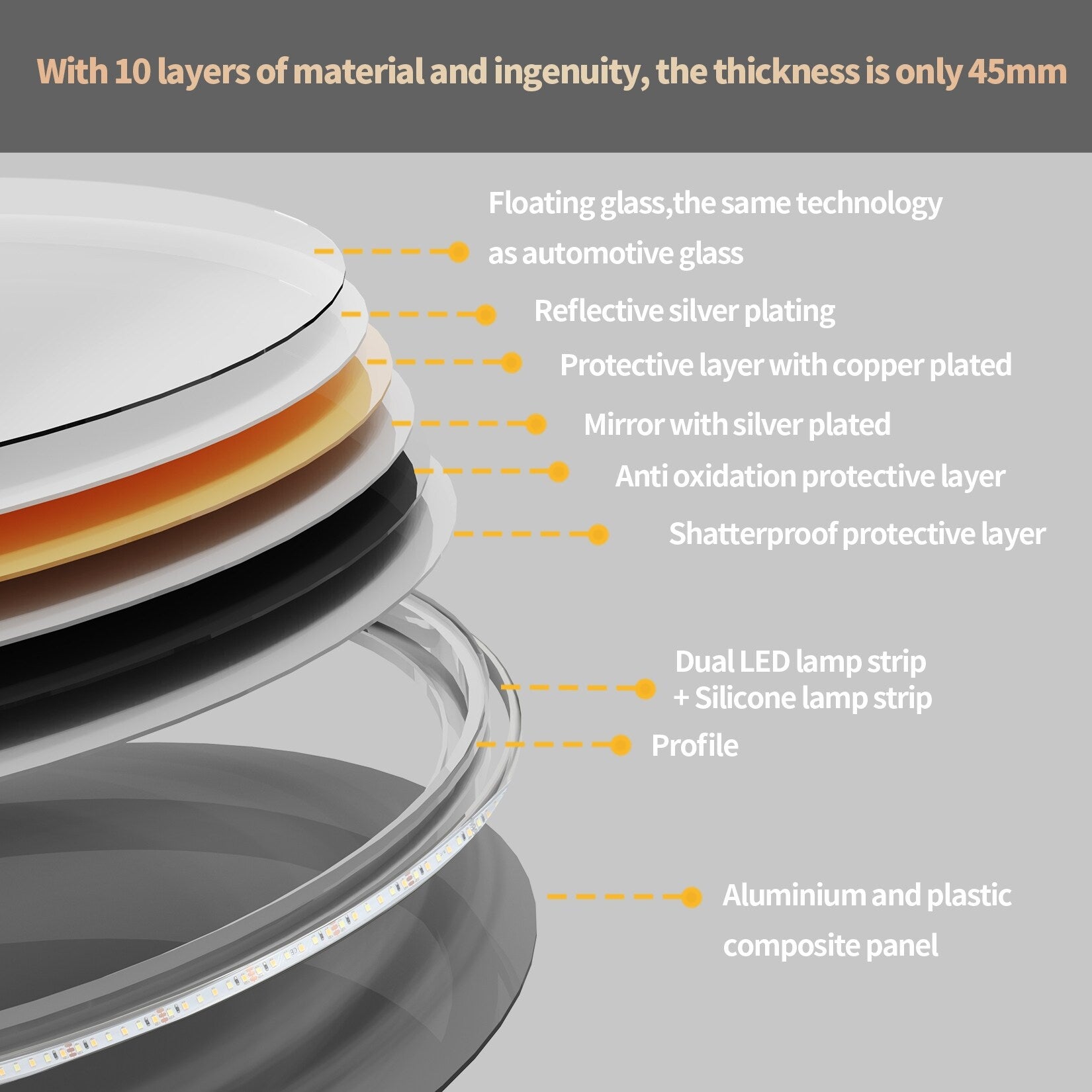 This lighted bathroom mirror has a characteristic round circle shape with attractive appealing look. The mirror has three lighting colors and adjustable brightness levels that provide perfect lighting for makeup and shaving, anti-fog function enables you can see clear reflection at all times. It’s an excellent choice for a large number of home bathrooms.