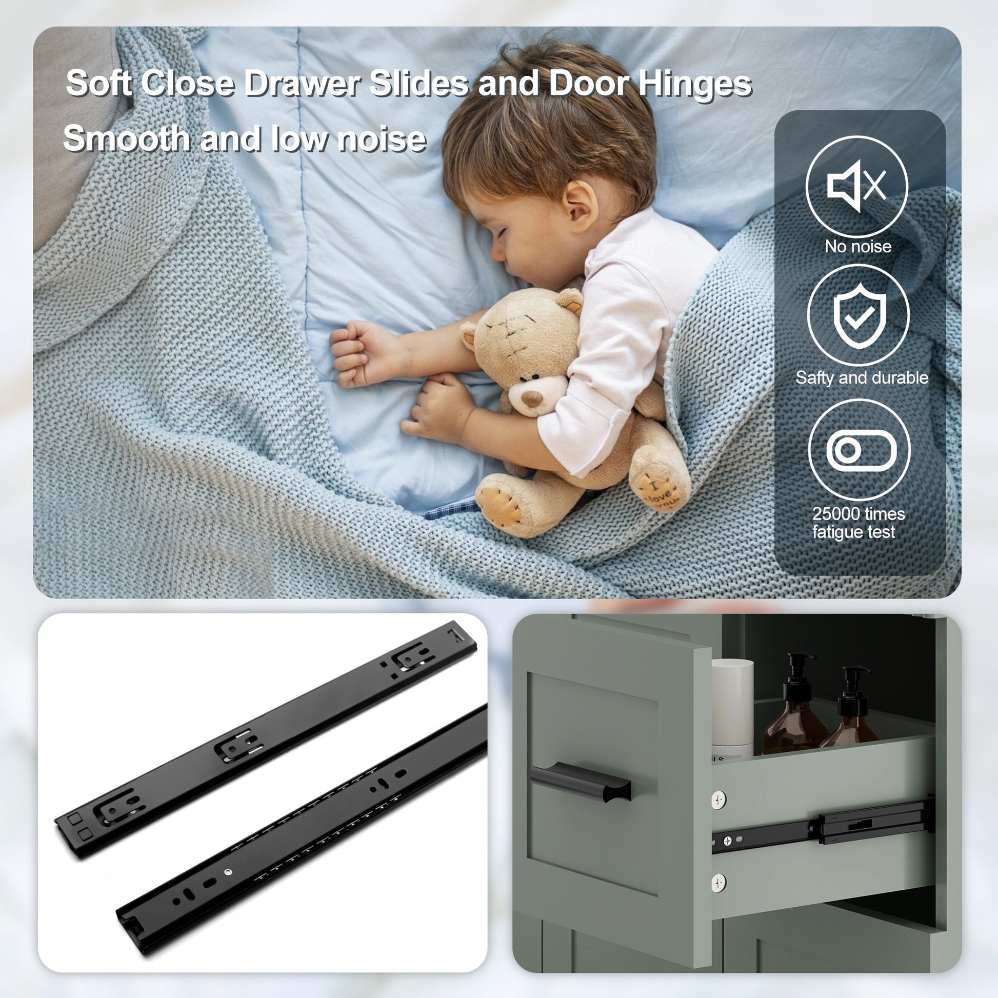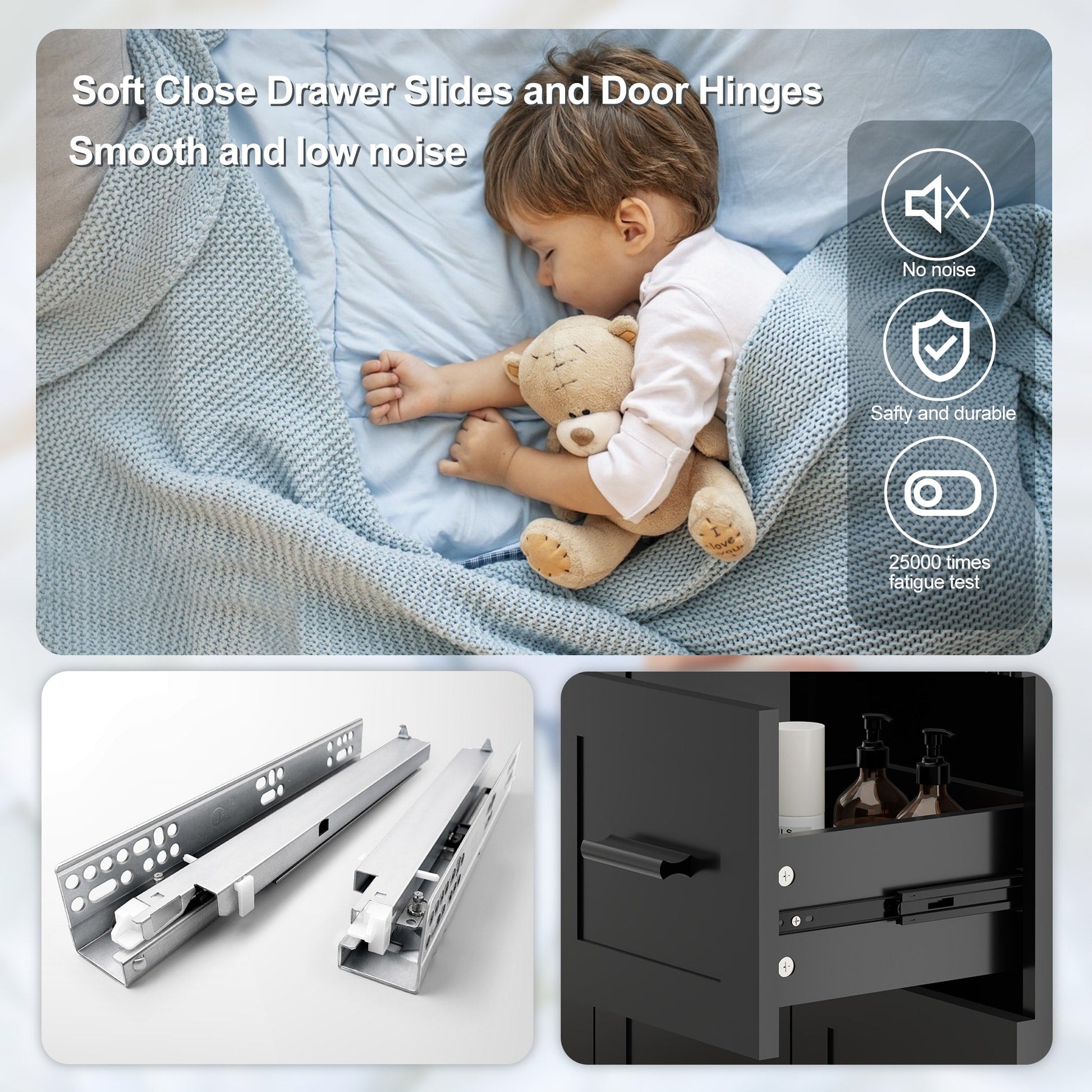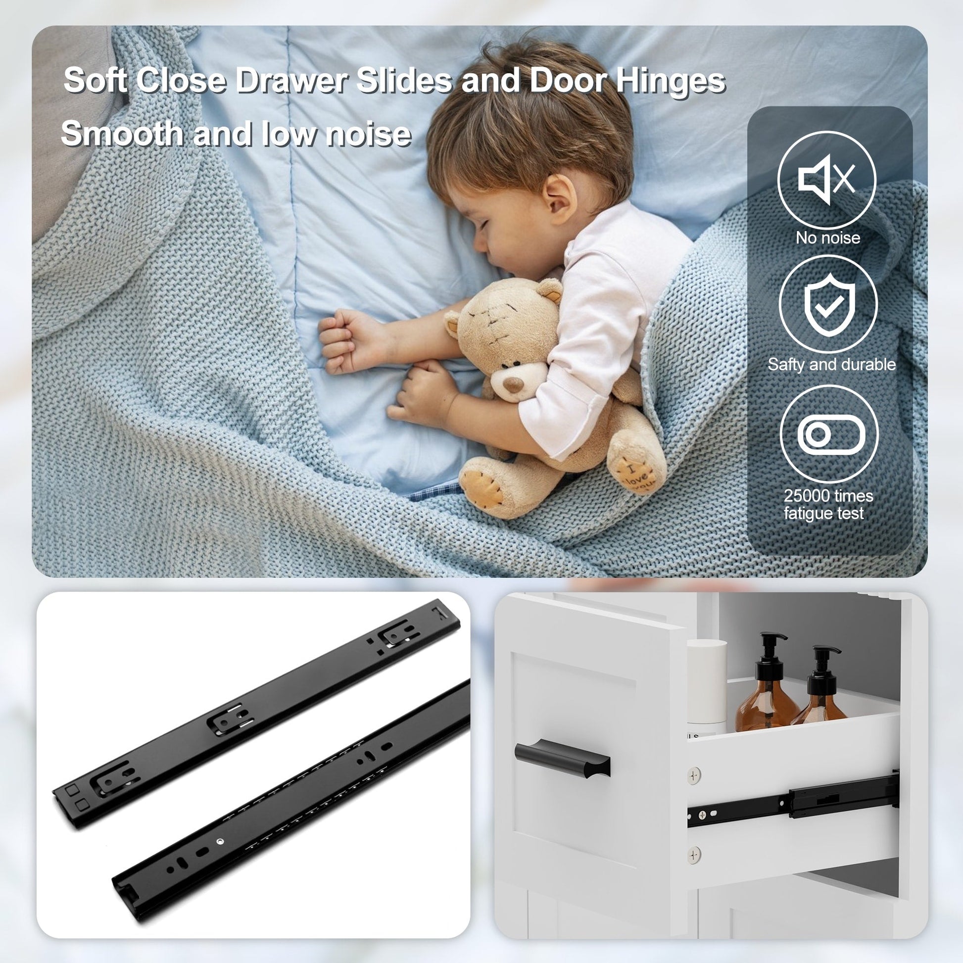 • Premium Soft-Close Drawers: Stainless steel undermount slides (25,000-cycle tested) ensure silent, smooth operation. 2 spacious drawers + adjustable shelf organize toiletries effortlessly.